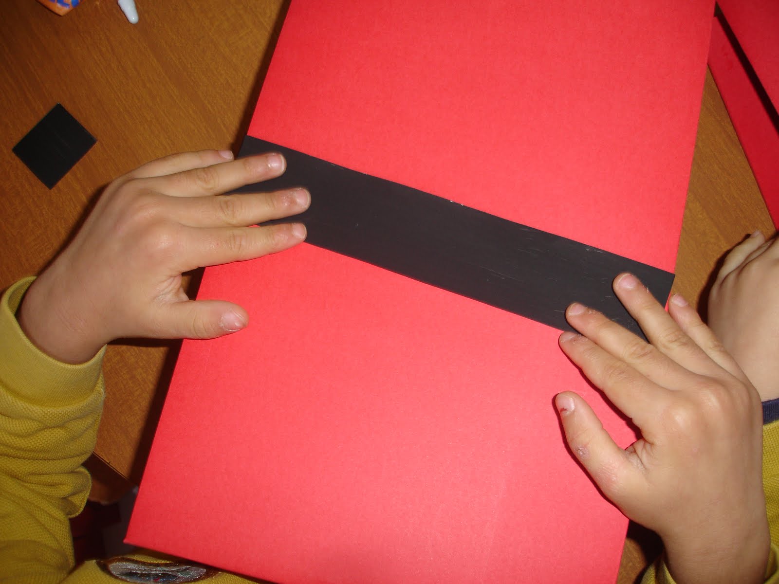 Fizemos as embalagens para guardar as prendas para os nossos pais. Usamos cartolina vermelhas e pintamos de preto tiras de cartolina, colamos fivelas e botões dourados, por fim colamos pêlo sintético...